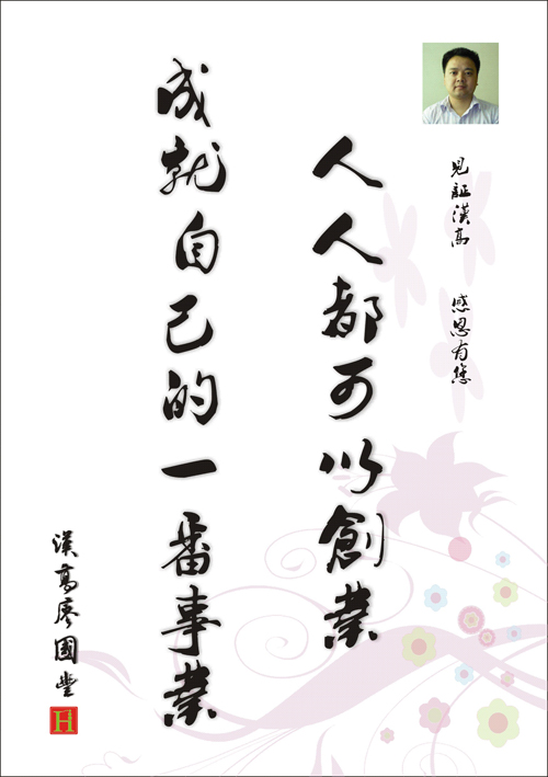 廖总一直对书法非常感兴趣,值此公司成立一周年之际,廖总提笔对所有加盟公司的创业伙伴励志题写了“人人都可以创业成就自己的一番事业”的书法。这个题词更加提升了创业者的创业信心,同心也坚定了与公司合作。