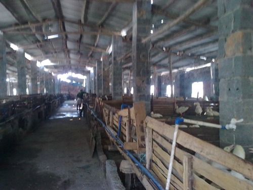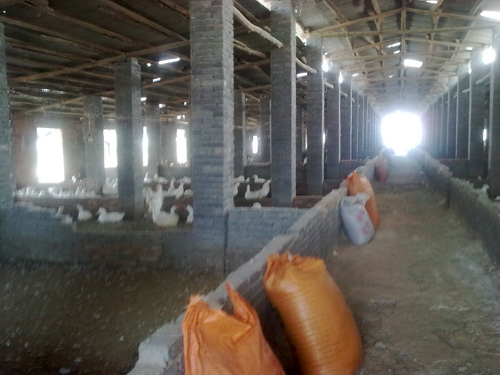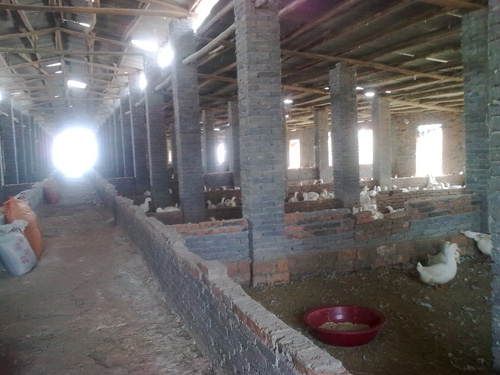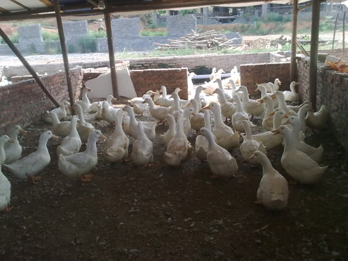中鸭的旱地圈养,以一批养1000只鸭为例,可利用竹木、旧墙、闲房等建60平方米的简易鸭舍,要求能遮阳、避雨、阴凉、通风,地面铺半寸高的干砂,鸭舍前开辟至少20平方米、深8寸左右的浅水池供鸭群洗浴活动。舍外有大于室内2~3倍面积的运动场。如无树荫、无搭凉棚,供炎热季节鸭群避暑栖息。