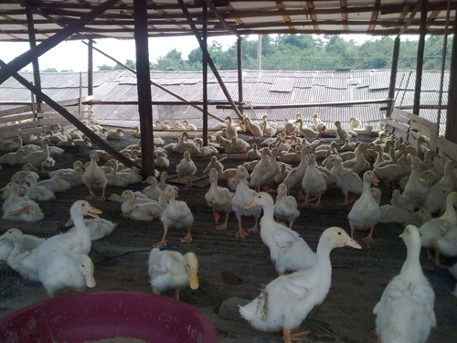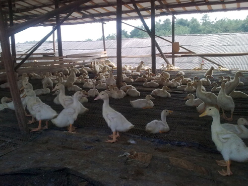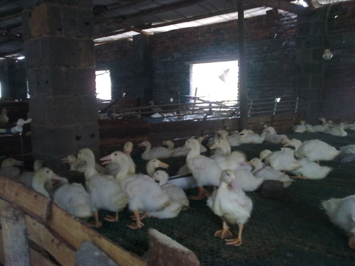 中鸭,是指从开始长粗毛(正羽)到长齐粗毛这一阶段的鸭,樱桃谷鸭为25~60日龄,此时鸭体重已达2公斤以上,每日可增重1~2两,樱桃谷鸭身躯硕大,行动迟缓,不宜在山岭、陡坡处放牧,一般多采用埋养圈牧结合适当放水活动的方式。圈养的好处是,管理方便,长膘迅速,有利于防止农药化肥中毒和避免疫病发生。
