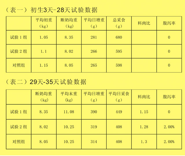 2、表二试验数据可以看出,试验1组各方面数据明显优于试验2组和对照组,而且腹泻率为零,说明试验1组从产品效果上讲在断奶后一周内是最合适的母乳替代品,大大减缓乳猪断奶生长停滞的影响,对于帮助乳猪度过断奶关意义重大;试验2组合对照组各项试验数据接近,差异不明显,说明“汉高(T6000)”教槽宝宝乳产品已很成熟可以和名牌教槽料媲美;