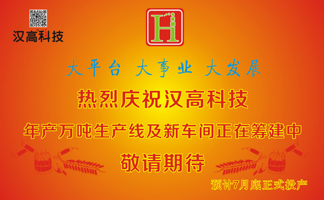 随着公司快速发展,现有工厂已不能满足生产发展需要,2015年6月18日,值得我们全体汉高创业合作伙伴记住的日子,年产万吨的全新工厂正在筹建中,我们已进入大汉高时代,我们努力打造汉高大平台,成就创业者的大事业,让我们步入大发展新时代,大平台,大事业,大发展已成为我们当下的新常态、新节奏!欢迎全国各地的创业精英加盟到我们汉高的新平台来,共谋新发展,成就大事业!