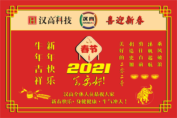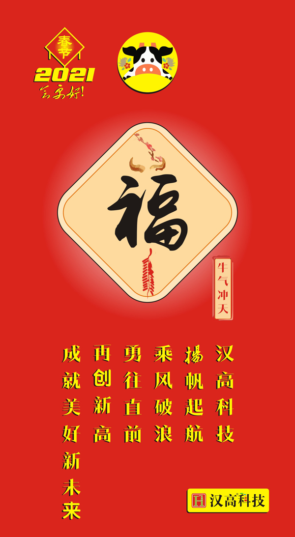 我们大力发扬孺子牛、拓荒牛、老黄牛精神,以不怕苦、能吃苦的牛劲牛力,不用扬鞭自奋蹄,继续为汉高事业辛勤耕耘、勇往直前,在新时代创造新的历史辉煌!值新春佳节之际,祝大家身体健康、工作顺利、阖家幸福、万事如意、牛年大吉、牛气冲天!我们一起携手,扬帆起航,乘风破浪,勇往直前,再创美好新未来!