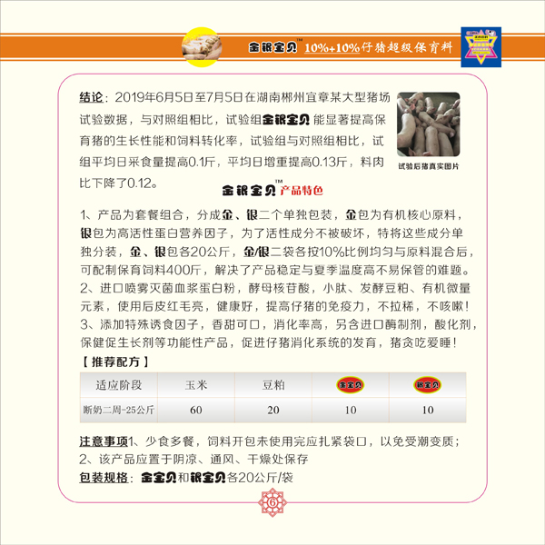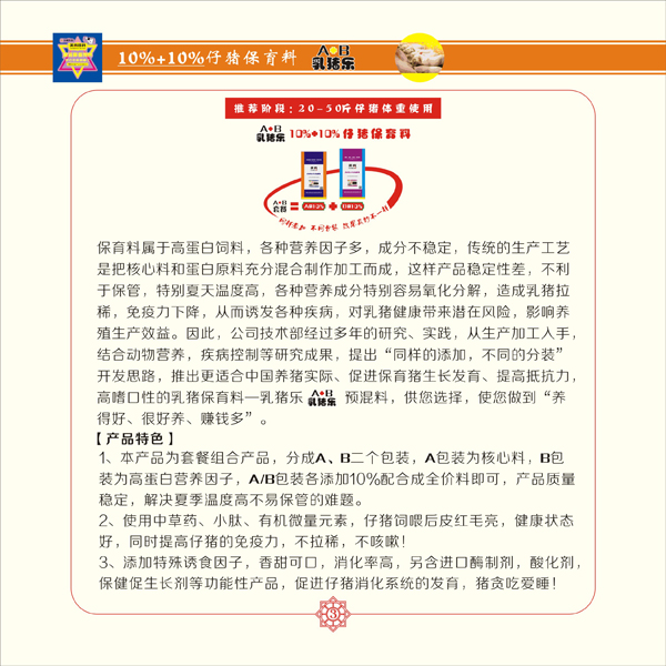 产品特点:1、本产品为套餐组合产品,分成A、B二个包装,A包装为核心料,B包装为高蛋白营养因子,A/B包装各添加10%配合成全价料即可,产品质量稳定,解决了复季温度高不易保管的难题2、使用中草药、小肽、有机微量元素,仔猪饲喂后皮红毛亮,健康状态好,同时提高仔猪的免疫力,不拉稀,不咳嗽!3、添加特殊诱食因子,香甜可口,消化率高,另含进口酶制剂,酸化剂,保健促生长剂等功能性产品,促进仔猪消化系统的发育,猪贪吃爱睡!
