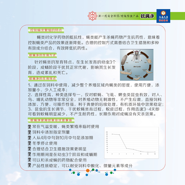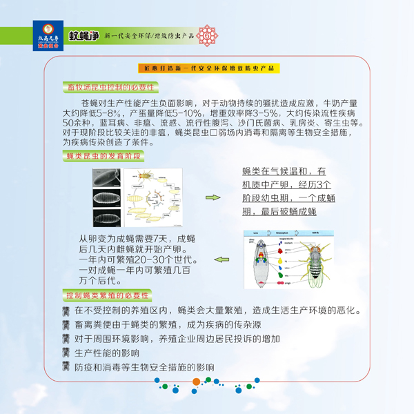 苍蝇对生产性能产生负面影响,对于动物持续的骚扰造成应激,牛奶产量大约降低5-8%,产蛋量降低5-10%,增重效率降3-5%,大约传染流性疾病50余种,蓝耳病、非瘟、流感、流行性腹泻、沙门氏菌病、乳房炎、寄生虫等。对于现阶段比较关洼的非瘟,蝇类昆虫減弱场内消毒和隔离等生物安全措施,为疾病传染创造了条件。