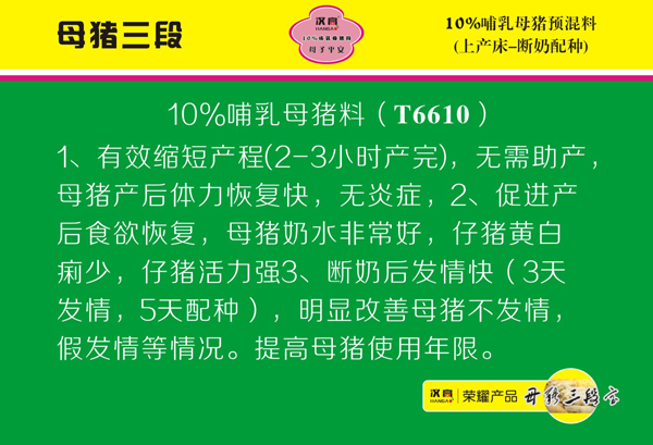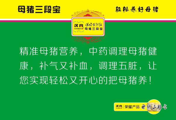 近些年来,汉高科技创新研究院团队针对母猪健康繁殖的研究,取得了重大成果,以改善母猪健康水平,提高养殖效益和行业可持续发展为出发点,综合运用现代营养、中兽医和生物技术手段,对母猪繁殖各环节中暴露出的问题,我们采用母仔一体化的系统营养干预,母猪精准营养,阶段细分,成功研发出10%系列保健型母猪料"母猪三段宝",从而轻松实现养母猪。